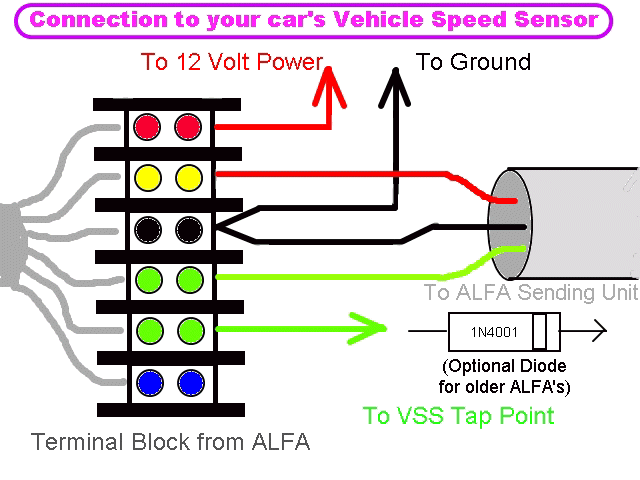 You may attach the input of your ALFA to the signal wire from the VSS at any point - under the hood, at the speedometer, at the engine control computer, cruise control computer or dashboard connection - where ever it is most convenient. Note that your power and ground wires should be wired directly to your vehicle power source, as described in the ALFA owner's manual. Do not run a separate ground to the VSS as this could create a "ground loop" situation which can cause your ALFA to misread the odometer pulses. The wire from the VSS to the ALFA should be as short as possible, and should avoid passing nearby ignition wires or other noise sources.